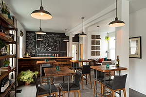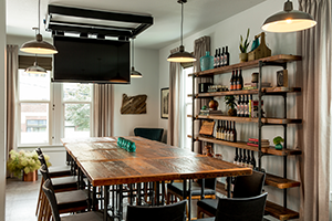 The Cellar 503 tasting room evokes a vintage industrial aesthetic, with elements designed by local craftsmen. Furnishings include reclaimed hardwood tables, a Chesterfield sofa, a hand-tufted area rug, linen drapes and farmhouse lighting. Historic photographs of pastoral Oregon, cork wallpaper and a custom mural painted by a local artist behind the reclaimed wood and copper bar provide a focal point.