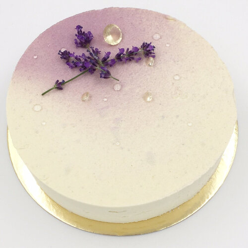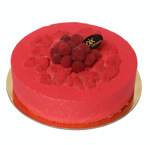Almond cake studded with raspberries and pistachios surrounds a raspberry mousse with pistachio cake and kirsch.